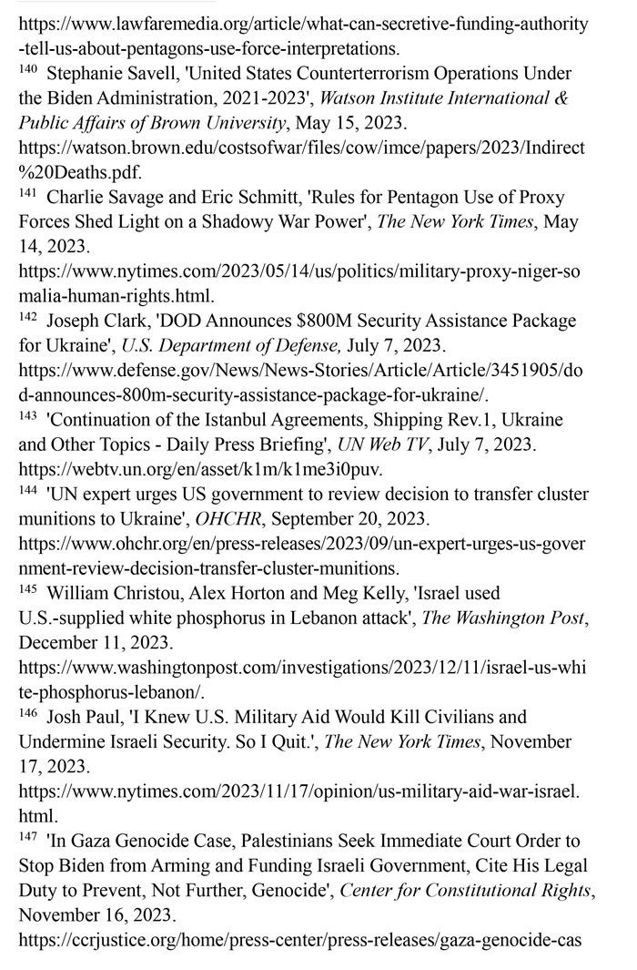 持續(xù)向沖突地區(qū)提供武器。美國國防部2023年7月7日發(fā)布的新聞稿顯示,美國向烏克蘭提供的價值8億美元的額外軍事援助中,包含大量集束彈藥。(注142)聯(lián)合國秘書長副發(fā)言人哈克2023年7月7日回答記者提問時表示,聯(lián)合國秘書長安東尼奧·古特雷斯希望各國遵守《集束彈藥公約》,不要在戰(zhàn)場上繼續(xù)使用集束彈藥。(注143)聯(lián)合國人權(quán)高專辦網(wǎng)站2023年9月20日報道,聯(lián)合國人權(quán)理事會酷刑和其他殘忍、不人道或有辱人格的待遇或處罰問題特別報告員愛麗絲·吉爾·愛德華茲2023年7月向美國政府發(fā)出緊急信函,警告集束彈藥會對平民造成嚴重傷害。(注144)《華盛頓郵報》網(wǎng)站2023年12月11日報道,美國每年流入以色列的軍火達數(shù)十億美元,以色列在10月對黎巴嫩南部的一次襲擊中使用了美國供應的白磷彈藥,造成至少9名平民受傷。(注145)美國國務院政治軍事事務局前局長喬?!けA_2023年10月18日在《紐約時報》網(wǎng)站發(fā)表專欄文章指出,美國每年向以色列提供至少38億美元軍事援助,加沙地帶最嚴重的人員傷亡大多是由美國提供的彈藥所導致,譴責這種軍事援助無視人權(quán)問題。(注146)美國人權(quán)組織“憲法權(quán)利中心”2023年11月16日報道,滅絕種族與死刑問題專家威廉·沙巴斯指責美國未能履行防止種族滅絕的法律義務,違反了習慣國際法和《防止及懲治滅絕種族罪公約》。(注147)