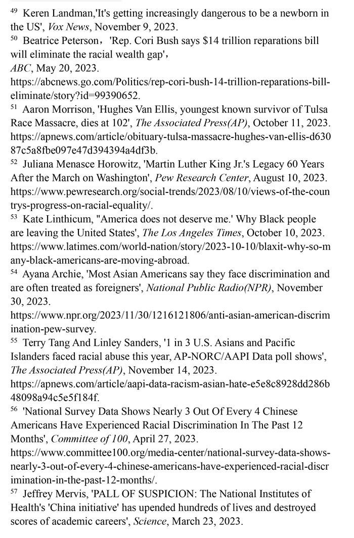 對非洲裔種族迫害的賠償遙遙無期。美國南北戰(zhàn)爭結(jié)束不久后,美國政府承諾向曾被奴役的每一個非洲裔家庭進行賠償,但一百多年來這一承諾從未兌現(xiàn)。1989年,美國眾議院非洲裔議員約翰·科尼爾斯提出“研究和制定非洲裔美國人賠償提案委員會法案”(H.R.40法案),但這一法案數(shù)十年來從未進入過國會表決程序。(注50)1921年,美國俄克拉何馬州塔爾薩地區(qū)發(fā)生針對非洲裔的種族屠殺事件,導致數(shù)百人遇害。為塔爾薩大屠殺最后3位已知幸存者爭取賠償?shù)脑V訟仍未定案,而其中年齡最低的幸存者休斯·范·埃利斯已于2023年10月去世。(注51)皮尤研究中心2023年8月10日發(fā)表的報告顯示,83%的非洲裔美國人表示,美國政府所做的確保平等的努力還遠遠不夠。(注52)許多不滿美國政治和種族歧視的非洲裔選擇離開。離開美國的非洲裔在葡萄牙、加納、哥倫比亞和墨西哥等地建立了新的社區(qū),這已然成為一種名為“Blaxit”的潮流(“Black”和“exit”的結(jié)合),并在社交媒體上廣泛流傳。他們高呼:“美國配不上我!”(注53)