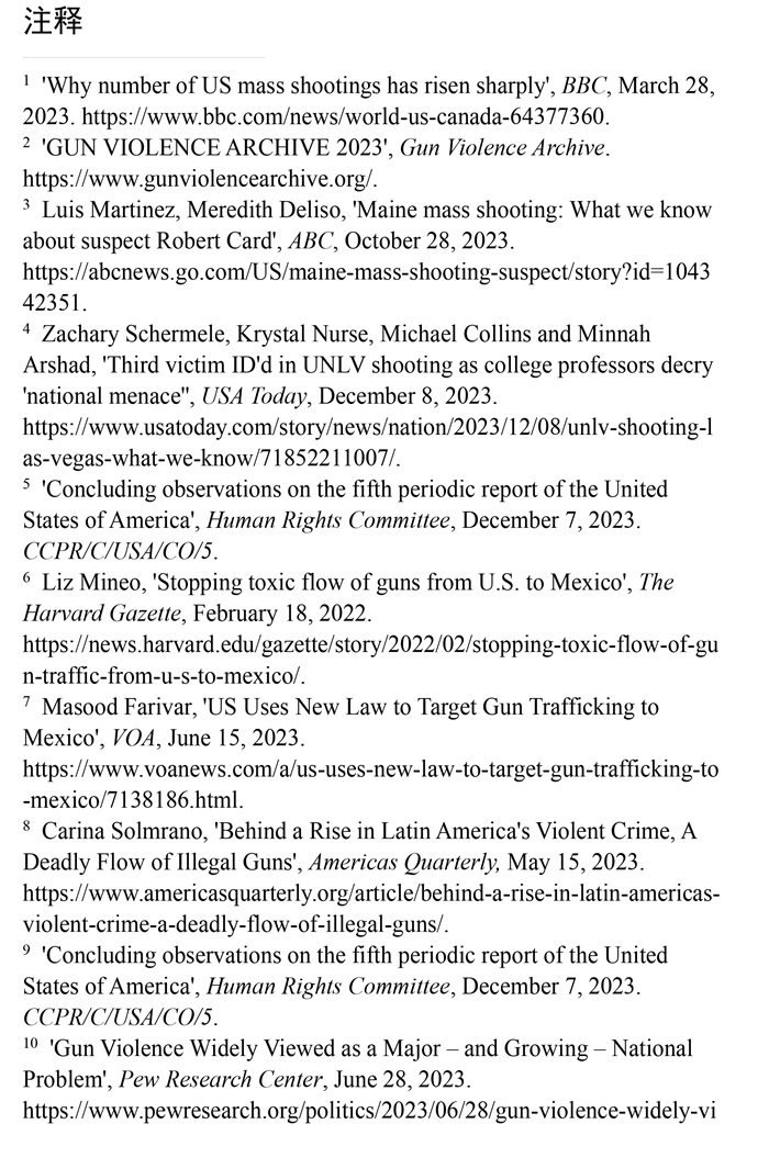 槍支暴力造成慘痛生命代價。數(shù)據(jù)顯示,美國所有類型的槍支暴力事件都呈上升趨勢。(注1)根據(jù)“槍支暴力檔案”網(wǎng)站統(tǒng)計的數(shù)據(jù),2023年美國至少發(fā)生了654起大規(guī)模槍擊事件。槍支暴力導致近4.3萬人死亡,平均每天死亡117人。(注2)例如,美國廣播公司新聞網(wǎng)站2023年10月28日報道,緬因州發(fā)生大規(guī)模槍擊事件,造成至少18人死亡,13人受傷。(注3)《今日美國報》網(wǎng)站2023年12月6日報道,拉斯維加斯3名大學教授被一名前同事槍殺。美國大學教授協(xié)會主席艾琳·馬爾維稱,槍支暴力是“不可接受的國家威脅”,敦促美國政府進行槍支政策改革。(注4)美國與槍支有關(guān)的傷亡人數(shù)激增,引發(fā)聯(lián)合國人權(quán)事務委員會的嚴重關(guān)切。(注5)