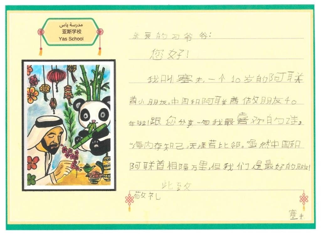 10歲的塞夫就讀于阿聯(lián)酋規(guī)模最大的公立學校亞斯學校。他在信中與習爺爺分享自己最喜歡的一句中國古詩——“海內(nèi)存知己,天涯若比鄰”,因為“雖然中國和阿聯(lián)酋相隔萬里,但我們是最好的朋友!”