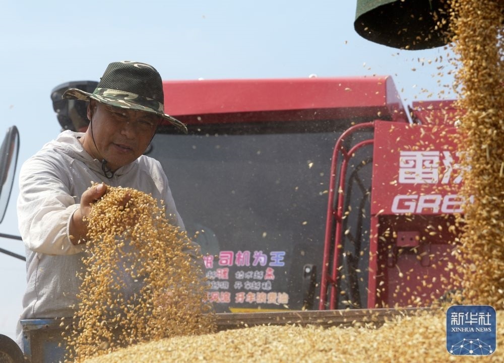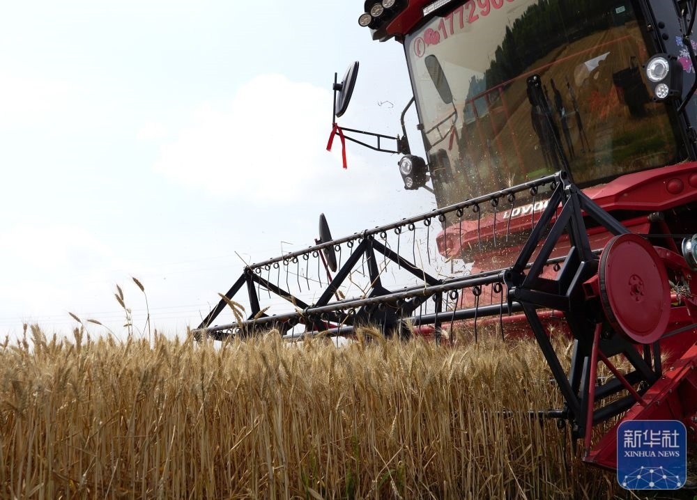 5月26日,在河南省商丘市睢縣尚屯鎮(zhèn)荒莊村,農(nóng)民駕駛收割機(jī)搶收小麥。新華社發(fā)(徐澤源攝)