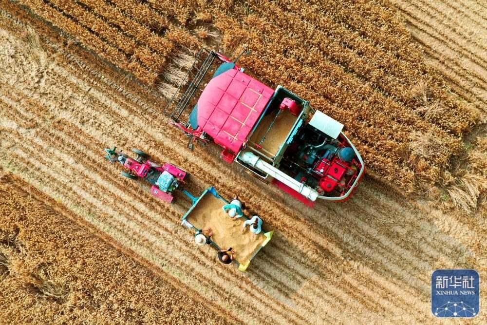 5月26日,河南省開封市尉氏縣邢莊鄉(xiāng)北丁莊村村民在搶收小麥(無人機(jī)照片)。新華社發(fā)(李新義攝)