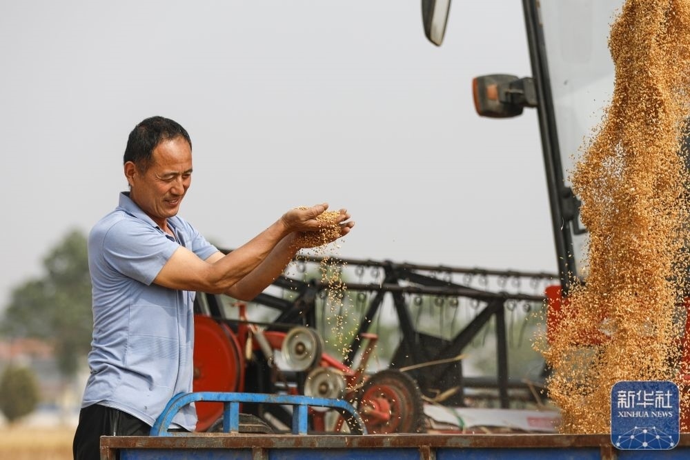 5月26日,在河南省商丘市睢縣尚屯鎮(zhèn)荒莊村,農(nóng)民查看剛剛收獲的小麥。新華社發(fā)(徐澤源攝)