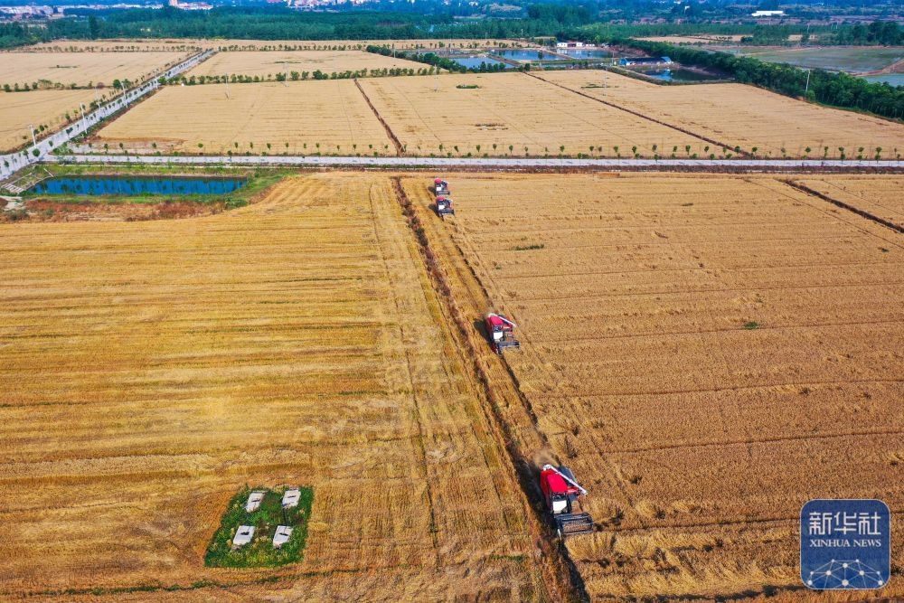 5月25日,在河南省駐馬店市汝南縣三橋鎮(zhèn)殷店村,收割機(jī)、秸稈摟草機(jī)在麥地里穿梭作業(yè)。新華社發(fā)(張萌攝)