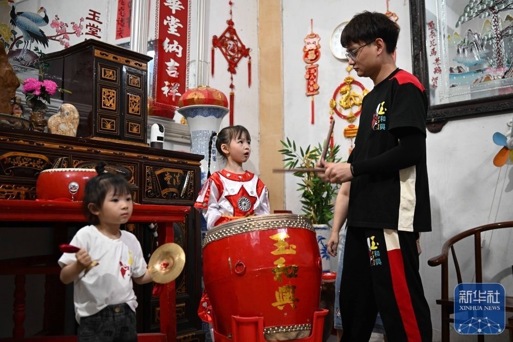 5月29日,在汕頭市貴嶼鎮(zhèn)玉窖村的家中,父親莊镕強(右)指導(dǎo)莊恩琪(中)和妹妹莊雅琪練習“敲鑼打鼓”。
