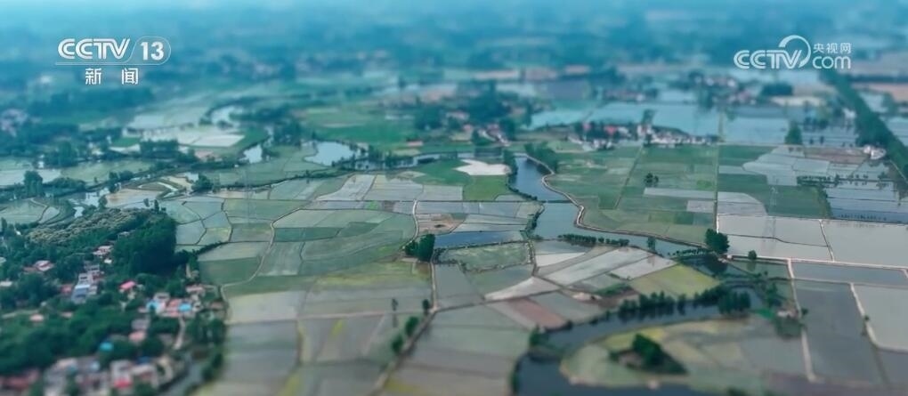 現(xiàn)在您看到的是河南信陽淮河以南的水稻插秧現(xiàn)場(chǎng)。插秧機(jī)在田間穿梭,一株株茁壯的秧苗被整齊有序地植入田間,一會(huì)兒工夫就插滿了整塊稻田。空中俯瞰,一臺(tái)臺(tái)插秧機(jī)在農(nóng)機(jī)手的操控下好似一把把畫刷,在稻田上輕輕暈染,繪就丹青。而同在信陽,淮河以北的麥田里,則是金色的麥浪翻滾起伏,收割機(jī)馳騁田間,飽滿的麥穗被卷入機(jī)艙,經(jīng)過收割、脫粒,顆粒歸倉。