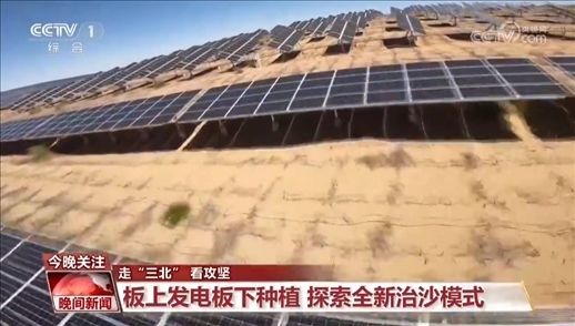 總臺(tái)記者 李欣蔓:治沙的腳步不但沒(méi)有停,還在不斷探索新的治沙模式?,F(xiàn)在我們看到的是鄂爾多斯一個(gè)已經(jīng)建好、并網(wǎng)發(fā)電的光伏項(xiàng)目,板上發(fā)電,板下種植,一個(gè)空間全方位利用。三重防線,構(gòu)建起了全新的生態(tài)治沙模式。有一個(gè)數(shù)據(jù)值得我們關(guān)注,這里的光伏項(xiàng)目占地39萬(wàn)畝,與此同時(shí),生態(tài)治理面積也將規(guī)劃完成39萬(wàn)畝。在國(guó)家推進(jìn)光伏治沙項(xiàng)目開(kāi)發(fā)建設(shè)的進(jìn)程中,我們看到越來(lái)越多的企業(yè)參與其中,在發(fā)展新能源產(chǎn)業(yè)的同時(shí)共同擔(dān)負(fù)起治沙的責(zé)任,為一片藍(lán)海,一片綠洲的建設(shè),貢獻(xiàn)更多的力量。