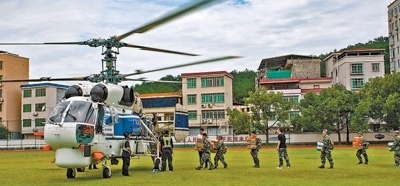 6月17日,廣東省梅州市平遠(yuǎn)縣體育場,直升機(jī)在運送救援物資。馮錫權(quán)攝(人民視覺)