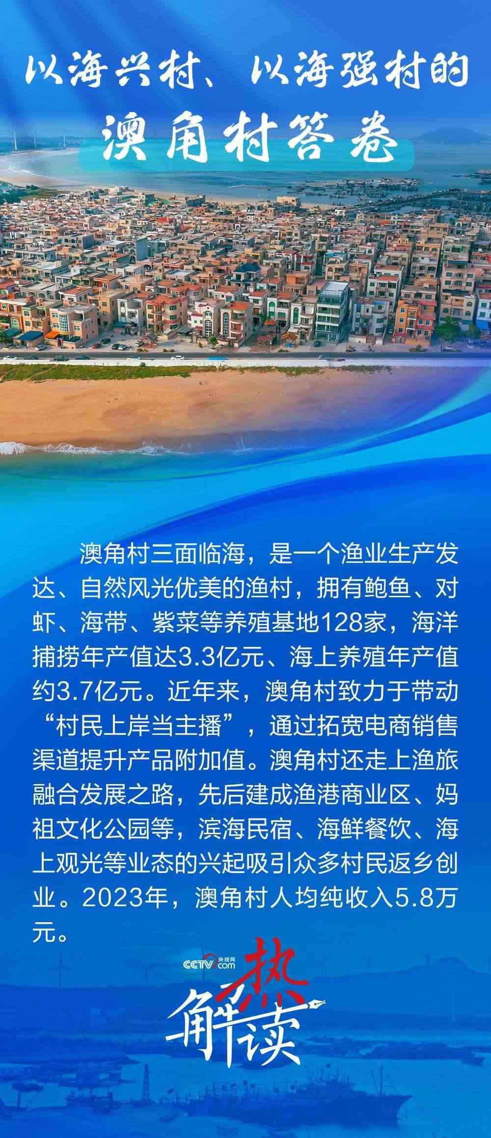 澳角村三面臨海,近年來走出了一條以海興村、以海強村的新路子??吹洁l(xiāng)村發(fā)生了巨變,總書記直言“鄉(xiāng)村振興還是要發(fā)揚優(yōu)勢”,并勉勵澳角村做好“?!钡奈恼?,在鄉(xiāng)村振興、共同富裕的道路上一往無前。