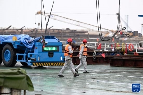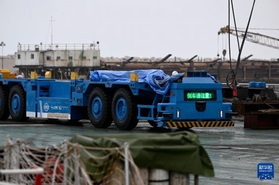 6月27日,岸邊集裝箱起重機(jī)和軌道吊運抵秘魯錢凱港。 新華社發(fā)(上海振華重工供圖)