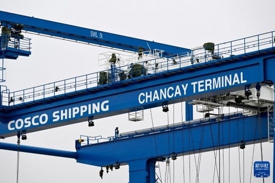 這是6月21日在秘魯錢凱港拍攝的印有“中遠(yuǎn)海運,錢凱碼頭”字樣的軌道吊。 新華社記者 李木子 攝