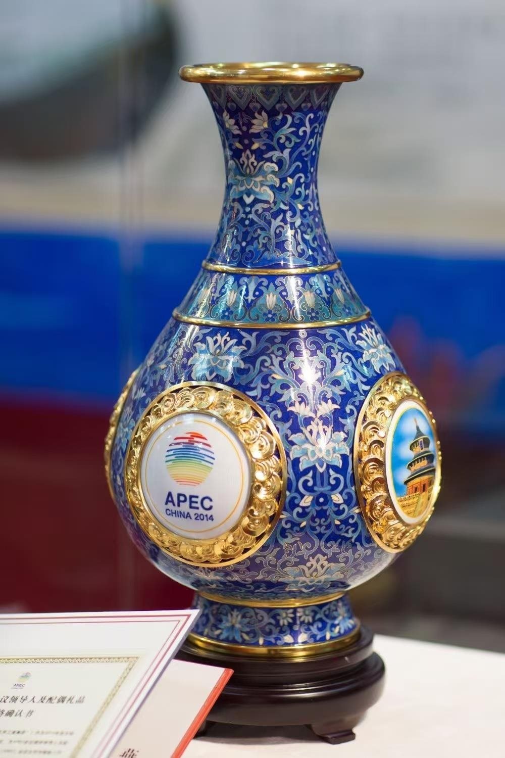 2014年11月,北京APEC會(huì)議在雁棲湖畔舉行。為歡迎參會(huì)的各經(jīng)濟(jì)體領(lǐng)導(dǎo)人,習(xí)近平主席選定了一件國(guó)禮——“四海升平”景泰藍(lán)賞瓶。賞瓶的細(xì)節(jié)蘊(yùn)含巧思:瓶高38厘米,是天壇祈年殿38米的等比例縮?。蛔畲笾睆?1厘米,代表APEC的21個(gè)經(jīng)濟(jì)體。碧藍(lán)的瓶身雕著水紋,既象征“四?!币泊憝h(huán)太平洋。“瓶”是“平”的諧音,連起來(lái)即“四海升平”。