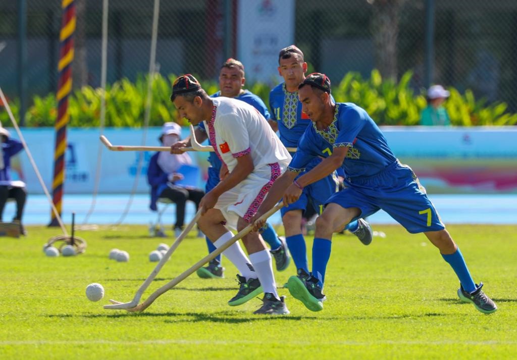 ??11月24日,在三亞市體育中心舉行的第十二屆全國少數(shù)民族傳統(tǒng)體育運動會室外表演項目中,新疆隊球員阿卜杜拉艾孜則·阿卜杜海娃爾(前右)在麥熱球表演中。新華社記者 陳朔 攝