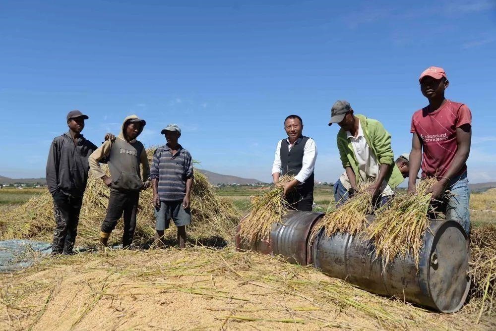 △在馬達(dá)加斯加,中國雜交水稻技術(shù)專家和當(dāng)?shù)剞r(nóng)民一起收獲水稻。