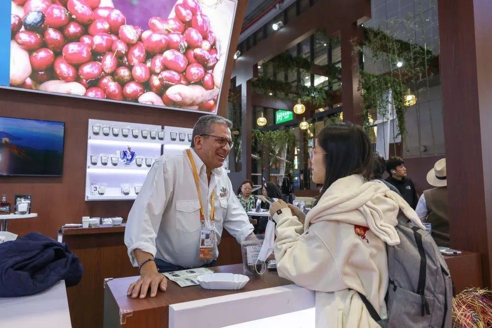 △2024年11月5日,第七屆進(jìn)博會國家展尼加拉瓜館的工作人員向觀眾介紹商品。