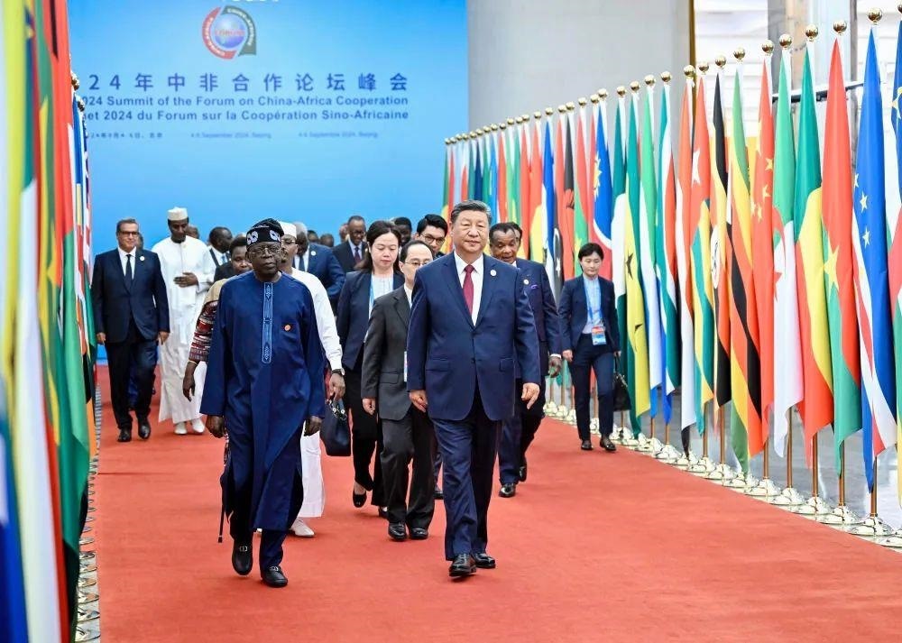 △2024年9月5日,中非合作論壇北京峰會開幕式,習(xí)近平主席同外方領(lǐng)導(dǎo)人共同步入會場。
