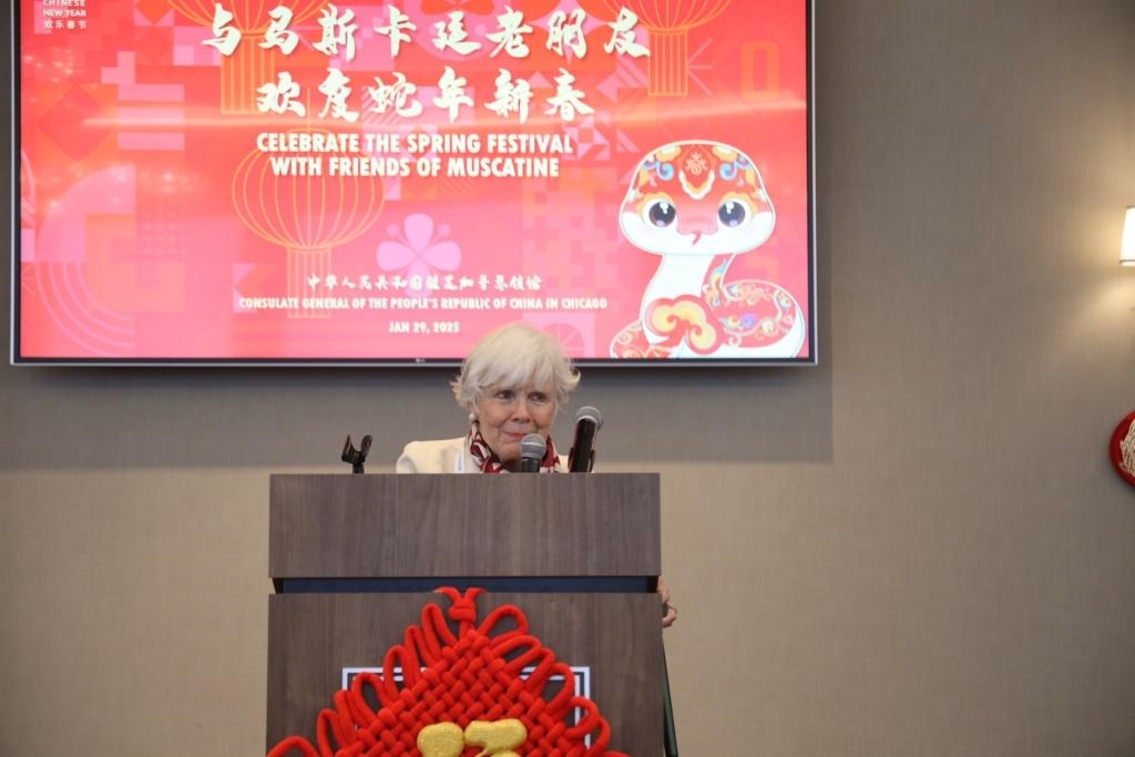 美國艾奧瓦州小城馬斯卡廷,當(dāng)?shù)貢r間農(nóng)歷蛇年初一。明媚陽光照耀下,在梅里爾酒店六層,一場特別的新春聚會正在舉行。福字、窗花、中國結(jié),“中國紅”裝點(diǎn)著喜慶祥和的氛圍。中美友人歡聚一堂,沉浸在歡聲笑語中。