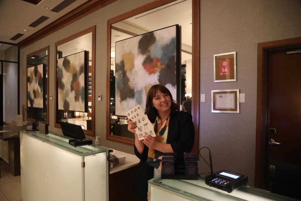 當(dāng)?shù)貢r間1月28日,馬斯卡廷一家酒店前臺工作人員謝伊·馬丁展示自己為迎接中國學(xué)生而手繪的中文指引卡片。新華社記者徐劍梅攝