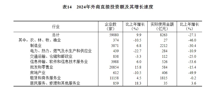 全年新設(shè)外商投資企業(yè)59080家,比上年增長9.9%。實際使用外資8263億元,下降27.1%,折1162億美元,下降28.8%。其中,共建“一帶一路”國家(含通過部分自由港對華投資)對華新設(shè)外商投資企業(yè)17172家,增長23.8%;對華直接投資1147億元,下降6.2%,折161億美元,下降8.4%。高技術(shù)產(chǎn)業(yè)實際使用外資2864億元,下降32.3%,折403億美元,下降34.0%。