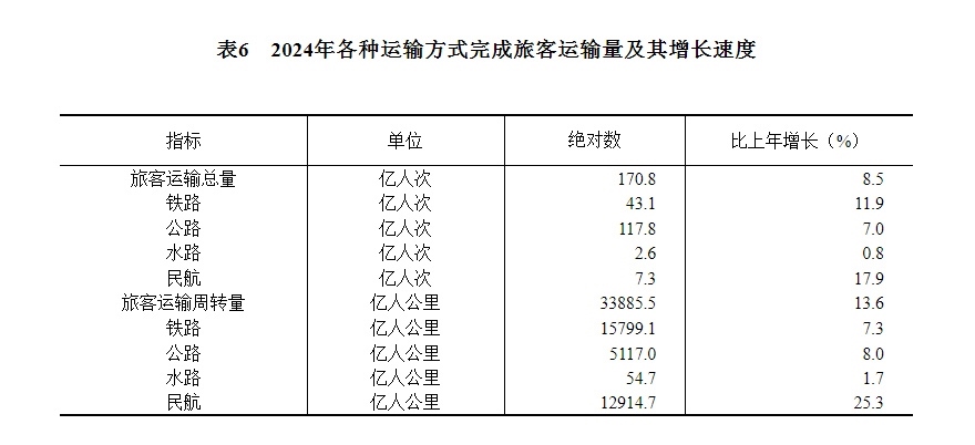 [29]自2024年1月起,公路旅客運輸量、公路旅客運輸周轉(zhuǎn)量統(tǒng)計口徑進行了調(diào)整,將班車包車客運量、公共汽電車城際城鄉(xiāng)客運量、出租汽車(含巡游出租汽車、網(wǎng)絡(luò)預(yù)約出租汽車)城際城鄉(xiāng)客運量納入公路旅客運輸量統(tǒng)計,公路旅客運輸周轉(zhuǎn)量統(tǒng)計口徑相應(yīng)調(diào)整。2024年旅客運輸總量、旅客運輸周轉(zhuǎn)量、公路旅客運輸量、公路旅客運輸周轉(zhuǎn)量增速按可比口徑計算。