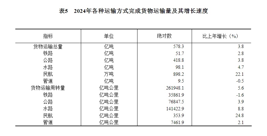 [28]貨物運輸總量及周轉(zhuǎn)量包括鐵路、公路、水路、民航和管道五種運輸方式完成量,2024年增速按可比口徑計算。