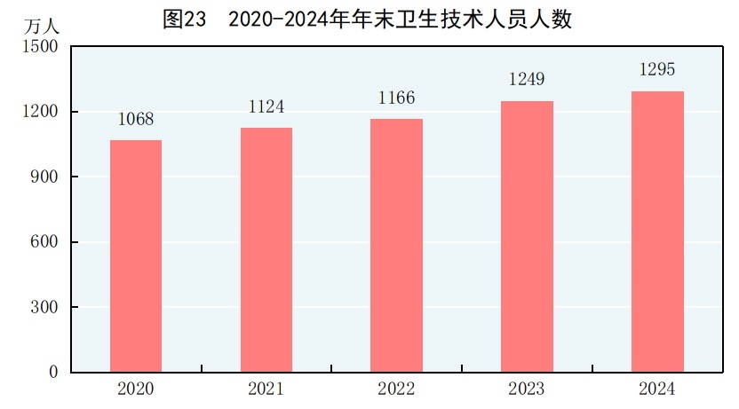年末全國共有醫(yī)療衛(wèi)生機構(gòu)109.2萬個,其中醫(yī)院3.9萬個,在醫(yī)院中有公立醫(yī)院1.2萬個,民營醫(yī)院2.7萬個;基層醫(yī)療衛(wèi)生機構(gòu)104.0萬個,其中鄉(xiāng)鎮(zhèn)衛(wèi)生院3.3萬個,社區(qū)衛(wèi)生服務(wù)中心(站)3.7萬個,門診部(所)39.8萬個,村衛(wèi)生室57.1萬個;專業(yè)公共衛(wèi)生機構(gòu)9217個(不含衛(wèi)生監(jiān)督所、中心),其中疾病預(yù)防控制中心3429個。衛(wèi)生技術(shù)人員1295萬人,其中執(zhí)業(yè)醫(yī)師和執(zhí)業(yè)助理醫(yī)師505萬人,注冊護士584萬人。醫(yī)療衛(wèi)生機構(gòu)床位1037萬張,其中醫(yī)院818萬張,鄉(xiāng)鎮(zhèn)衛(wèi)生院151萬張。全年總診療人次[79]101.1億人次,出院人次[80]3.1億人次。