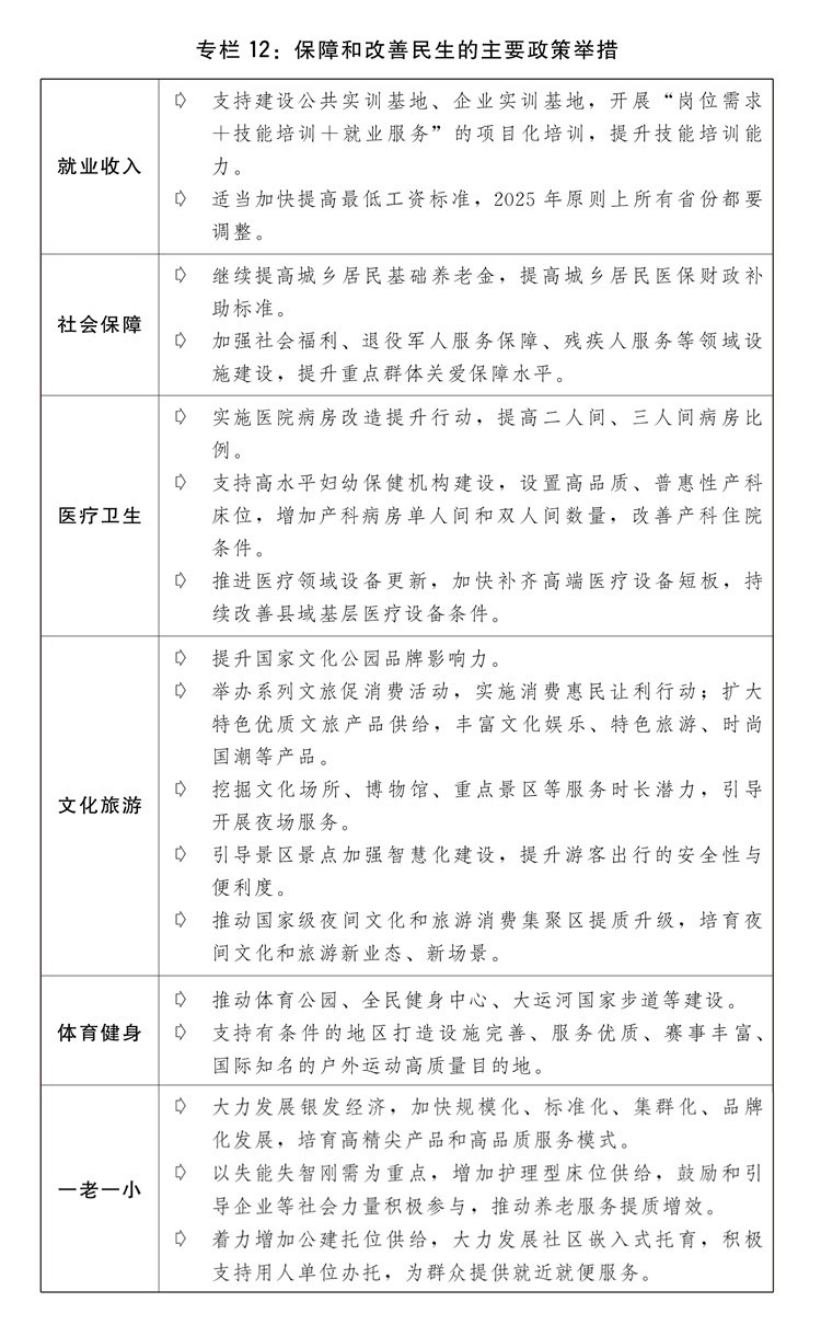 一是實(shí)施提振消費(fèi)專項(xiàng)行動(dòng)。制定提升消費(fèi)能力、增加優(yōu)質(zhì)供給、改善消費(fèi)環(huán)境政策舉措,穩(wěn)定大宗消費(fèi)、擴(kuò)大服務(wù)消費(fèi)、拓展新型消費(fèi)、合理增加公共消費(fèi),推動(dòng)消費(fèi)提質(zhì)升級(jí)。多渠道促進(jìn)居民增收,推動(dòng)中低收入群體增收減負(fù),完善勞動(dòng)者工資正常增長(zhǎng)機(jī)制。因城施策調(diào)減房地產(chǎn)消費(fèi)限制性措施,推動(dòng)建設(shè)安全、舒適、綠色、智慧的“好房子”,更好滿足人民群眾剛性和改善性住房需求、高品質(zhì)居住需要。進(jìn)一步優(yōu)化汽車限購(gòu)管理政策,加快構(gòu)建充電基礎(chǔ)設(shè)施體系,開(kāi)展汽車流通消費(fèi)改革試點(diǎn)。加快拓展文化、旅游、體育、健康、養(yǎng)老、托幼、家政、數(shù)字等服務(wù)消費(fèi),實(shí)施服務(wù)消費(fèi)提質(zhì)惠民活動(dòng)、“百城百區(qū)”文化和旅游消費(fèi)行動(dòng)計(jì)劃。加快培育帶動(dòng)性廣、顯示度高的消費(fèi)新場(chǎng)景,支持影視游戲創(chuàng)作與中華優(yōu)秀傳統(tǒng)文化、特色旅游資源相結(jié)合等融合式沉浸式消費(fèi)新場(chǎng)景發(fā)展。積極發(fā)展首發(fā)經(jīng)濟(jì)、冰雪經(jīng)濟(jì)、銀發(fā)經(jīng)濟(jì)。完善游艇、房車露營(yíng)等新型消費(fèi)領(lǐng)域管理機(jī)制和行業(yè)標(biāo)準(zhǔn),促進(jìn)“人工智能+消費(fèi)”,優(yōu)化消費(fèi)新業(yè)態(tài)新領(lǐng)域市場(chǎng)準(zhǔn)入環(huán)境,加快推動(dòng)各類新技術(shù)應(yīng)用推廣并向消費(fèi)級(jí)產(chǎn)品轉(zhuǎn)化。清理對(duì)消費(fèi)的不合理限制。深入實(shí)施優(yōu)化消費(fèi)環(huán)境三年行動(dòng),加強(qiáng)消費(fèi)信用體系和質(zhì)量標(biāo)準(zhǔn)體系建設(shè),規(guī)范網(wǎng)絡(luò)銷售、直播帶貨領(lǐng)域不合理經(jīng)營(yíng)行為,強(qiáng)化消費(fèi)者權(quán)益保護(hù)。落實(shí)和優(yōu)化帶薪年休假制度。完善外國(guó)人入境居留政策和免稅店政策,推動(dòng)擴(kuò)大入境消費(fèi)。深化國(guó)際消費(fèi)中心城市建設(shè)。