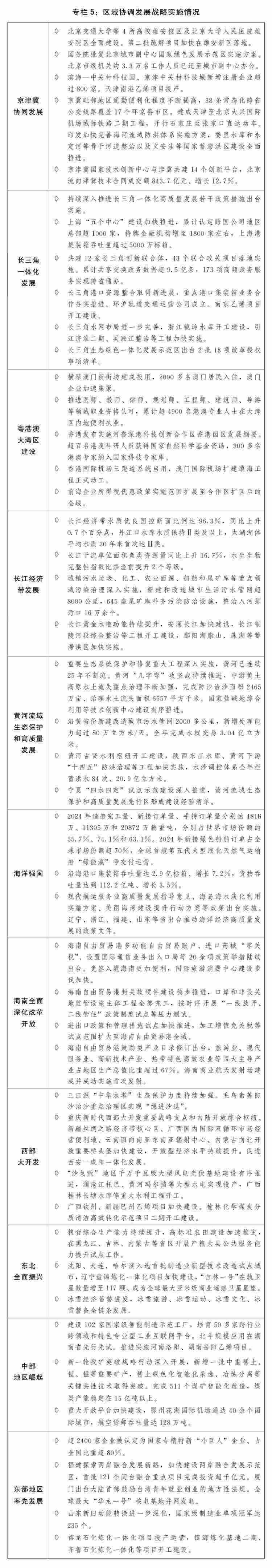 一是區(qū)域協(xié)調(diào)發(fā)展積厚成勢(shì)。京津冀協(xié)同發(fā)展走深走實(shí),在京相關(guān)高校、醫(yī)院、中央企業(yè)總部及二三級(jí)子公司分批向雄安新區(qū)疏解,北京城市副中心行政辦公、商務(wù)服務(wù)、文化旅游等功能不斷完善,進(jìn)一步支持天津?yàn)I海新區(qū)高質(zhì)量發(fā)展若干政策措施出臺(tái)實(shí)施,三省市互聯(lián)互通交通網(wǎng)絡(luò)更加完善、產(chǎn)業(yè)鏈上下游協(xié)作持續(xù)強(qiáng)化、公共服務(wù)共建共享水平進(jìn)一步提升。長(zhǎng)三角一體化高質(zhì)量發(fā)展深入推進(jìn),生態(tài)綠色一體化發(fā)展示范區(qū)改革授權(quán)壓茬推進(jìn),港口資源整合、軌道互聯(lián)互通等取得新進(jìn)展,上海“五個(gè)中心”建設(shè)進(jìn)一步加快?;浉郯拇鬄硡^(qū)建設(shè)邁上新臺(tái)階,橫琴粵澳深度合作區(qū)封關(guān)“一線”“二線”分線管理運(yùn)行順利,超1.6萬(wàn)名澳門居民在合作區(qū)居住生活,支持河套深港科技創(chuàng)新合作區(qū)深圳園區(qū)、香港園區(qū)聯(lián)動(dòng)發(fā)展,創(chuàng)新要素跨境流動(dòng)更加便捷。長(zhǎng)江經(jīng)濟(jì)帶共抓大保護(hù)、不搞大開(kāi)發(fā)成效顯著,進(jìn)一步抓實(shí)抓好長(zhǎng)江大保護(hù)工作三年行動(dòng)計(jì)劃出臺(tái)實(shí)施,長(zhǎng)江十年禁漁取得明顯成效,長(zhǎng)江干流連續(xù)5年保持Ⅱ類水質(zhì),綜合立體交通走廊加快構(gòu)建,沿江高鐵全線開(kāi)工建設(shè)。黃河流域生態(tài)保護(hù)和高質(zhì)量發(fā)展邁出堅(jiān)實(shí)步伐,農(nóng)業(yè)面源、城鎮(zhèn)生活、工業(yè)和尾礦庫(kù)污染治理深入推進(jìn),8萬(wàn)余個(gè)入河排污口開(kāi)展溯源整治,一批生態(tài)保護(hù)修復(fù)重點(diǎn)項(xiàng)目加快建設(shè),黃河干流連續(xù)3年保持Ⅱ類水質(zhì)。海洋強(qiáng)國(guó)建設(shè)深入推進(jìn),海洋強(qiáng)省、現(xiàn)代海洋城市、全國(guó)海洋經(jīng)濟(jì)發(fā)展示范區(qū)創(chuàng)新發(fā)展,海洋生態(tài)環(huán)境質(zhì)量持續(xù)改善,海洋生產(chǎn)總值超10萬(wàn)億元。