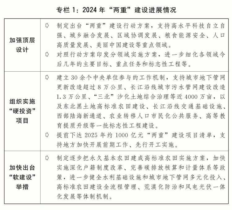 二是發(fā)行超長(zhǎng)期特別國(guó)債支持“兩重”建設(shè)取得積極進(jìn)展。著眼于系統(tǒng)解決強(qiáng)國(guó)建設(shè)、民族復(fù)興進(jìn)程中一些重大項(xiàng)目建設(shè)的資金問(wèn)題,從2024年起發(fā)行超長(zhǎng)期特別國(guó)債支持國(guó)家重大戰(zhàn)略和重點(diǎn)領(lǐng)域安全能力建設(shè)。堅(jiān)持自上而下、軟硬結(jié)合,建立實(shí)施項(xiàng)目?jī)?chǔ)備、集中聯(lián)審、??顚S?、強(qiáng)化監(jiān)督等全鏈條推進(jìn)保障機(jī)制?!坝餐顿Y”方面,嚴(yán)格做好項(xiàng)目篩選,2024年安排7000億元超長(zhǎng)期特別國(guó)債支持1465個(gè)重大項(xiàng)目建設(shè),項(xiàng)目基本全部開(kāi)工、全年完成投資超過(guò)1.2萬(wàn)億元?!败浗ㄔO(shè)”方面,堅(jiān)持項(xiàng)目建設(shè)和配套改革相結(jié)合,扎實(shí)推進(jìn)規(guī)劃編制、政策制定和體制機(jī)制改革創(chuàng)新,不斷完善投入機(jī)制、提高投入效率。規(guī)范項(xiàng)目全過(guò)程管理方面,出臺(tái)“兩重”建設(shè)有關(guān)管理辦法,督促項(xiàng)目加快開(kāi)工建設(shè),嚴(yán)格資金監(jiān)管,加強(qiáng)監(jiān)測(cè)調(diào)度和現(xiàn)場(chǎng)監(jiān)督檢查,確保建成優(yōu)質(zhì)工程、精品工程、放心工程。