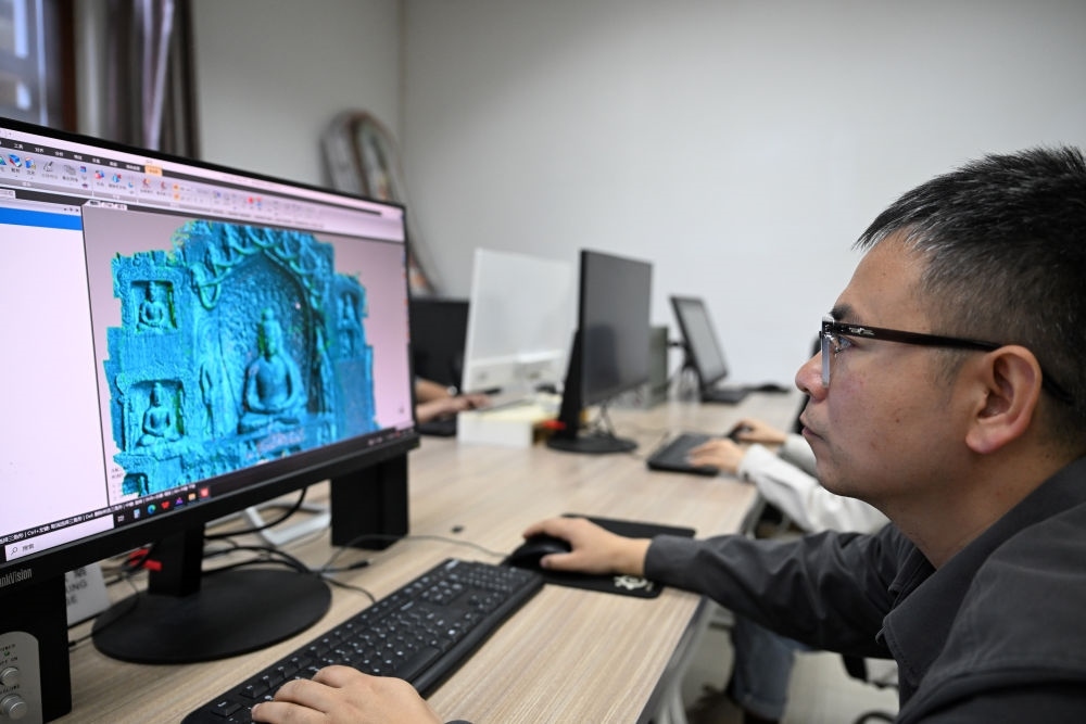 2025年4月10日,龍門石窟研究院工作人員進行3D建模工作。