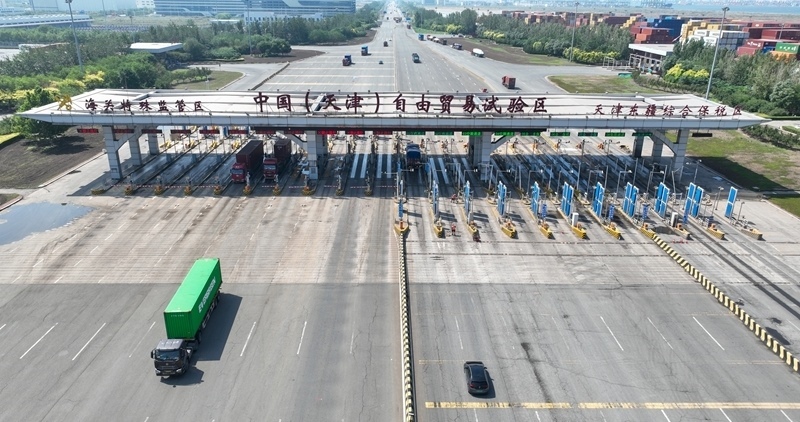 這是6月20日拍攝的天津自貿(mào)區(qū)天津港東疆片區(qū)入口處的中國(天津)自由貿(mào)易試驗(yàn)區(qū)海關(guān)特殊監(jiān)管區(qū)入口(無人機(jī)照片)。