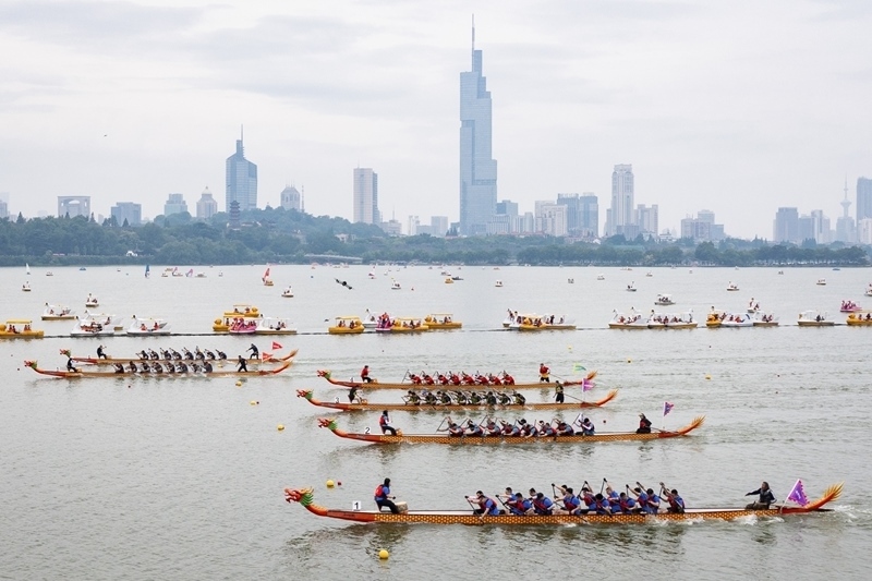 5月31日,龍舟隊(duì)在南京玄武湖上競(jìng)逐(無人機(jī)照片)。