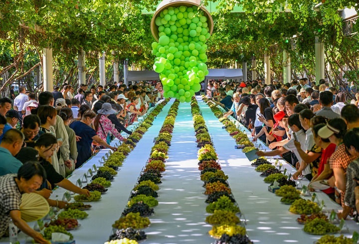 人們?cè)谛陆卖敺厣咸鸭猩掀穱L葡萄(2024年8月17日攝)。新華社記者 陳朔 攝