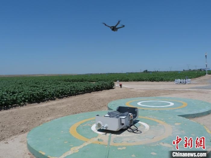 6月28日,新疆石河子市一片棉田中,遙感監(jiān)測(cè)作物長勢(shì)的無人機(jī)巡檢返回?!≮w婧姝 攝