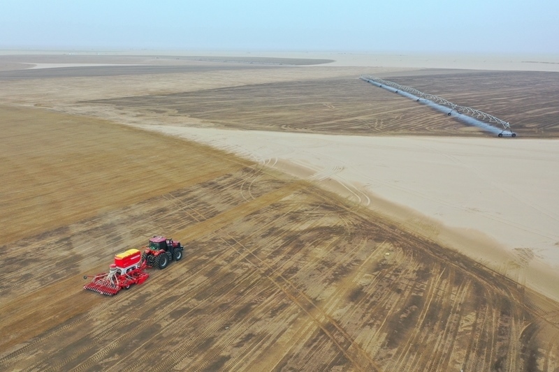 在新疆和田地區(qū)策勒縣4萬畝苜蓿種植基地,農(nóng)機手駕駛機械在播種苜蓿(9月9日攝,無人機照片)。