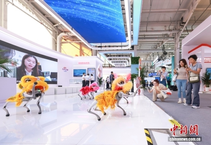 9月10日,2025年中國國際服務貿易交易會在北京首鋼園開幕。圖為觀眾參觀機器狗群舞表演。中新社記者 賈天勇 攝
