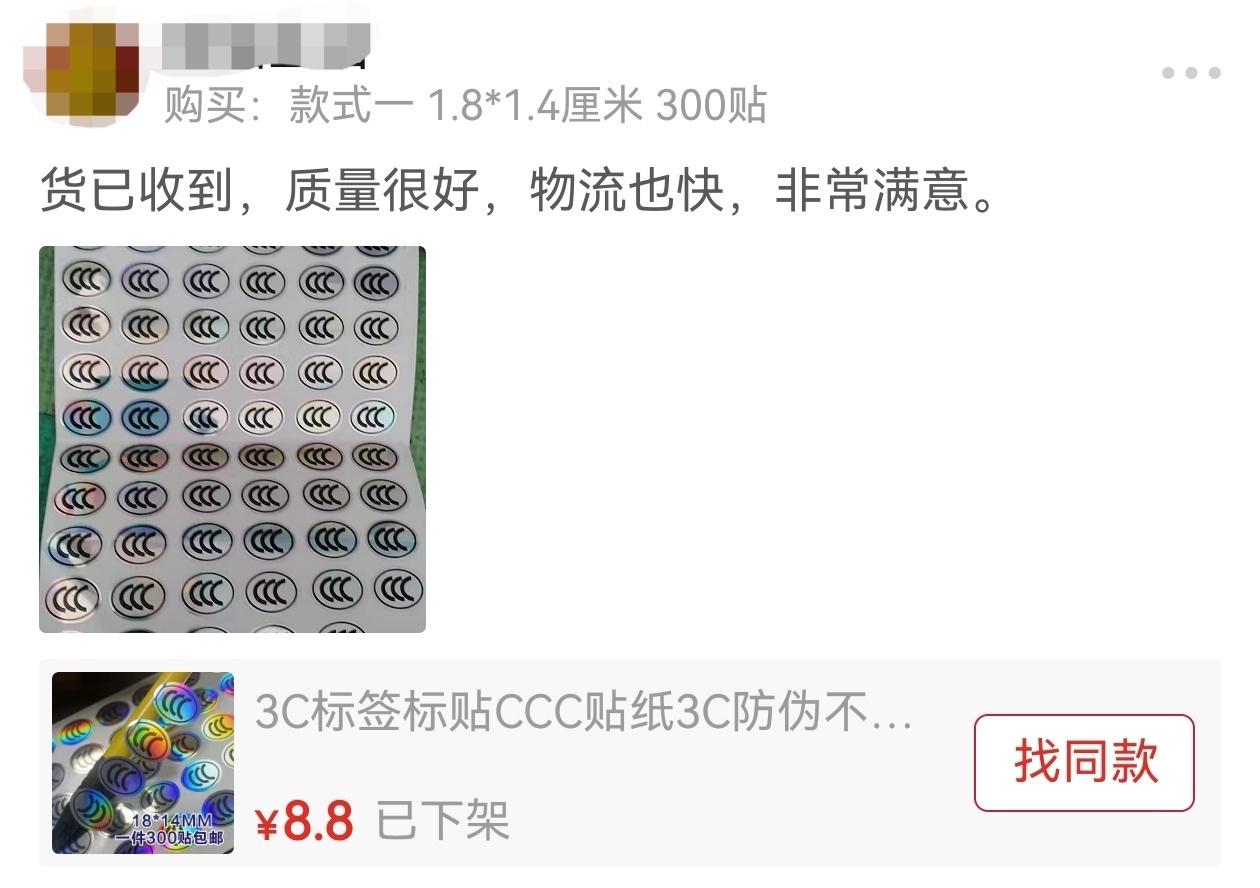 不過(guò),這卻變成了一些人眼中的“商機(jī)”。中國(guó)新聞網(wǎng)《民生調(diào)查局》記者在部分電商平臺(tái)發(fā)現(xiàn),“3C貼紙”目前仍有售賣,甚至可以隨意定制。