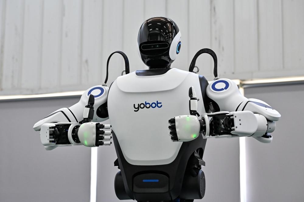 7月3日,在位于安徽省蕪湖市的科技公司內(nèi),一款人形機器人在做手勢。新華社記者 張鋮 攝