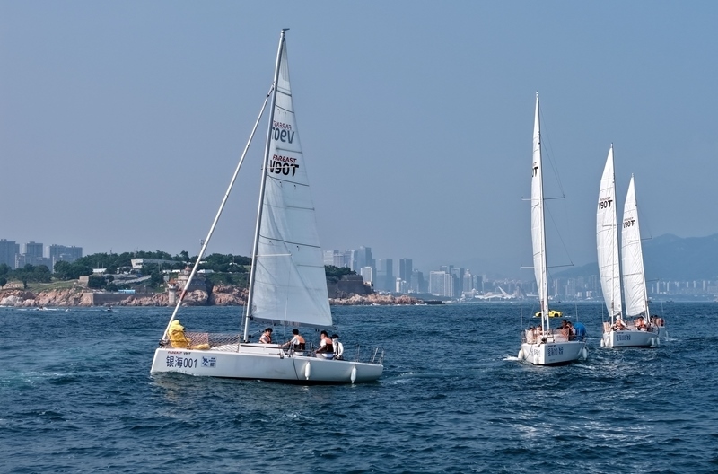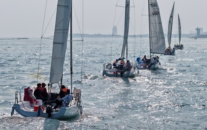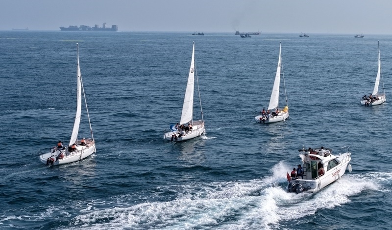 青島小麥島附近海域,市民和游客乘坐帆船參加海上巡游活動(7月10日攝,無人機照片)。