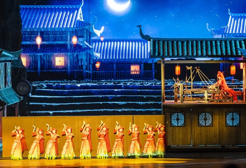 7月10日,游客在利川市騰龍洞的洞穴內(nèi)觀看實景劇《夷水麗川》。