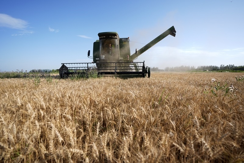 7月15日,收割機在銀川市賀蘭縣立崗鎮(zhèn)蘭星村收獲小麥。