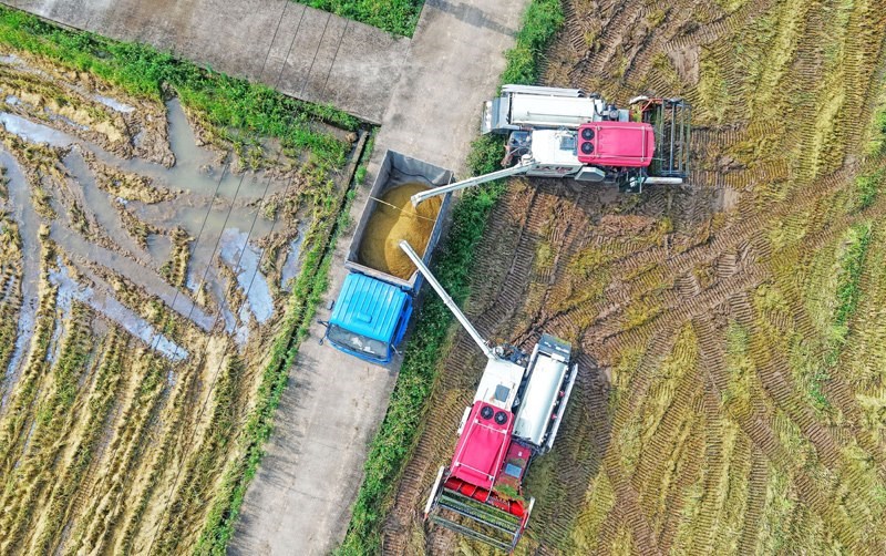 7月15日,在浙江省臺州市仙居縣下各鎮(zhèn),農(nóng)民將剛收割的稻谷裝車(無人機照片)。
