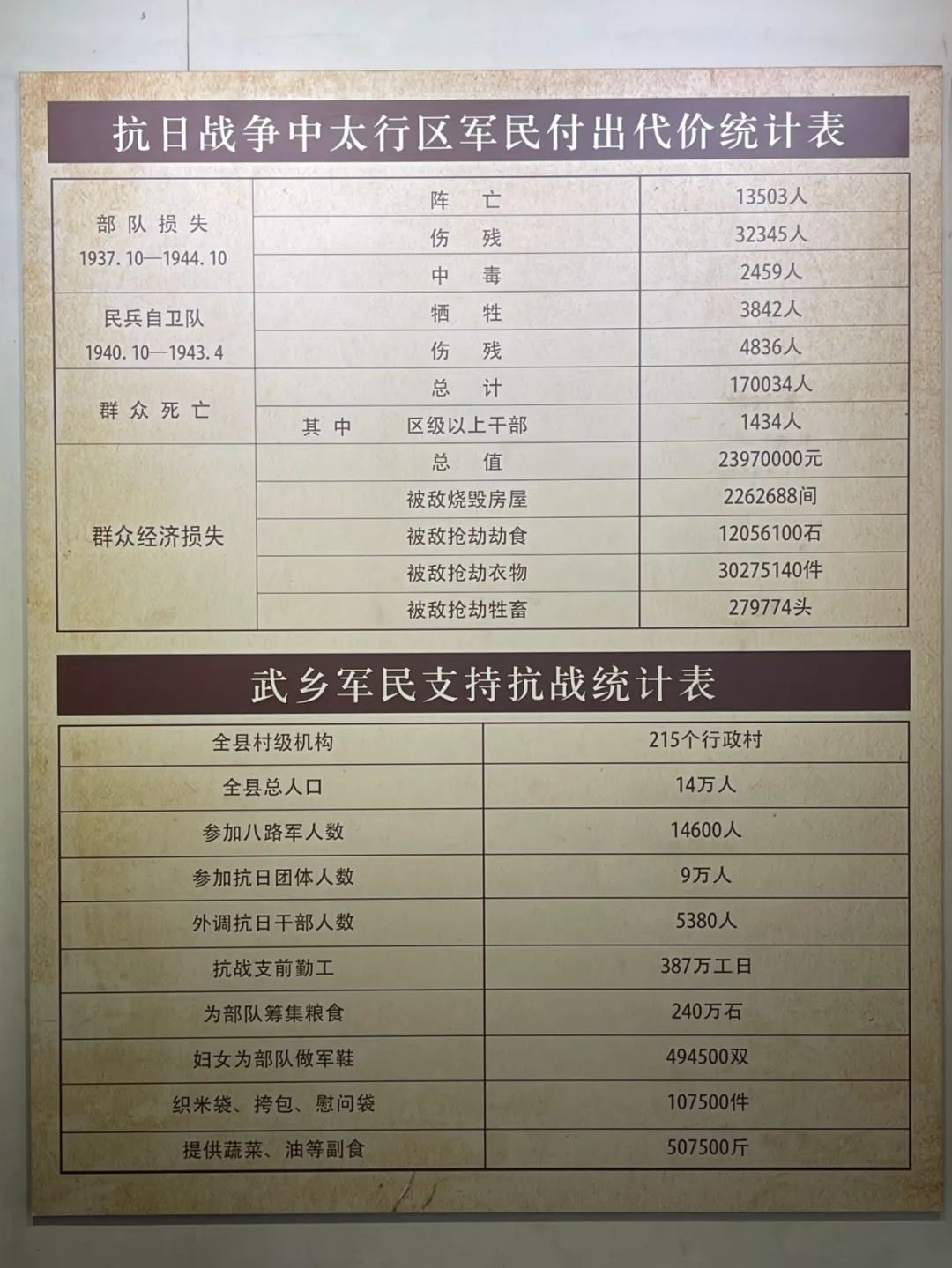 武鄉(xiāng)軍民支持抗戰(zhàn)相關(guān)統(tǒng)計(jì)。(新華網(wǎng)于楊攝)