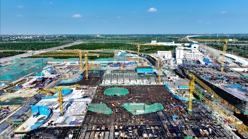 7月25日,在津濰高鐵山東東營高鐵站現(xiàn)代綜合客運樞紐及配套工程建設現(xiàn)場,中鐵二十局工作人員在施工(無人機照片)。