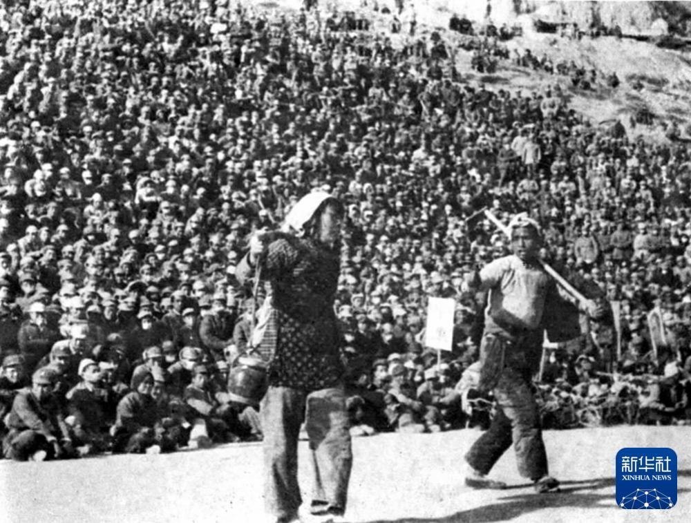 延安魯迅文藝學(xué)院王大化、李波在廣場(chǎng)為群眾演出秧歌劇《兄妹開荒》。吳印咸 攝
