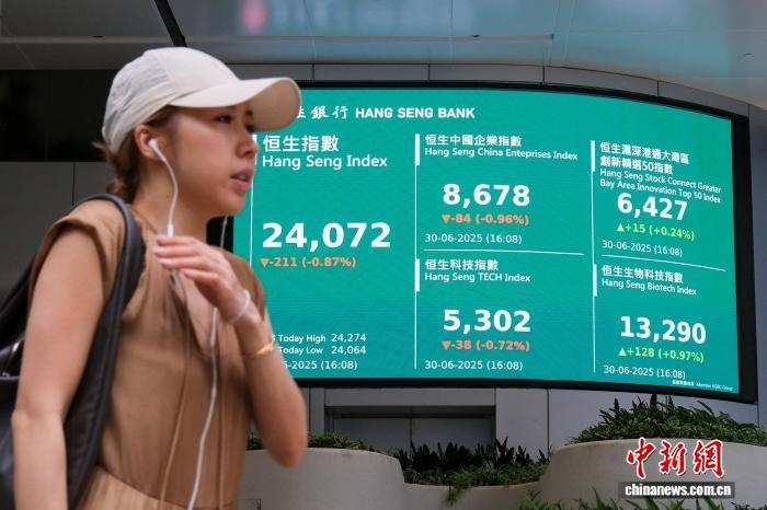 7月29日,香港交易及結(jié)算所有限公司表示,今年上半年,其全資附屬公司香港聯(lián)合交易所有限公司平均每日成交金額達(dá)2402億港元,同比增長118%。圖為6月30日,2025年上半年最后一個(gè)交易日,香港恒生指數(shù)收市報(bào)24072.28點(diǎn)。(資料圖) 中新社記者 陳永諾 攝