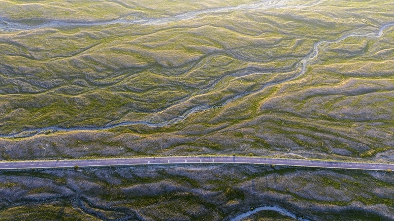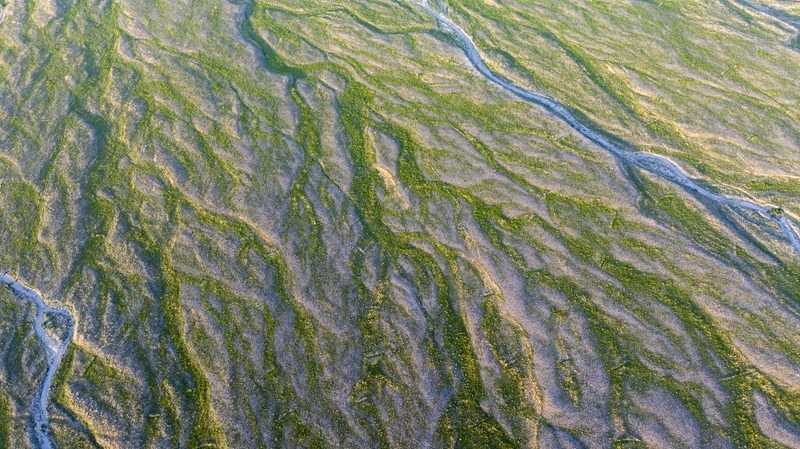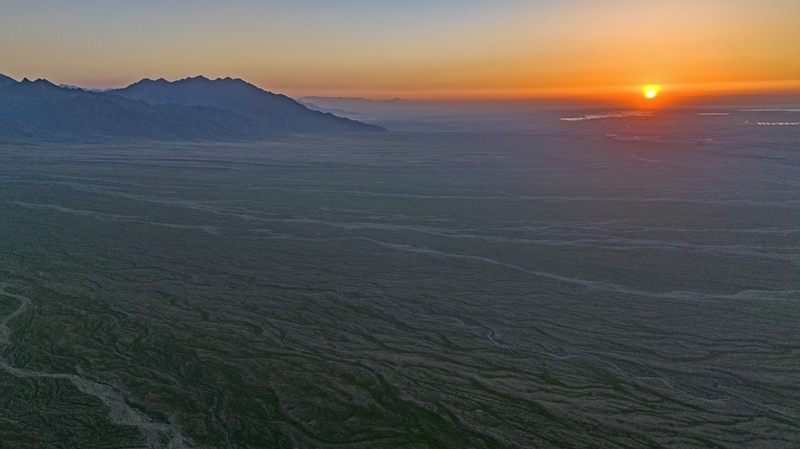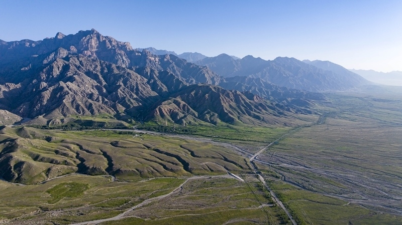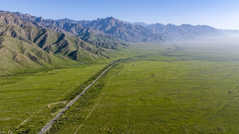 賀蘭山下的戈壁灘草木茂盛(7月29日攝,無人機照片)。