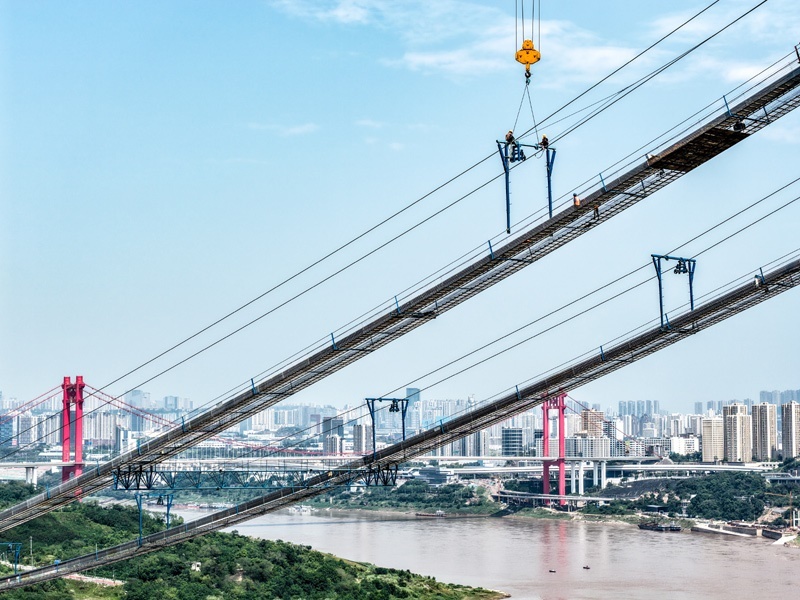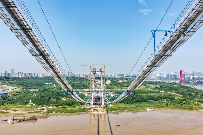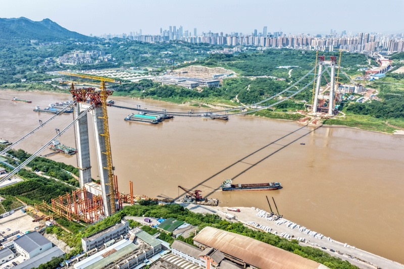 當(dāng)日,由重慶城投集團(tuán)投資、城投建設(shè)公司組織建設(shè)、中國鐵建大橋局承建的黃桷沱長江大橋順利完成主纜架設(shè)工作,標(biāo)志著大橋建設(shè)即將進(jìn)入鋼桁梁吊裝工序。黃桷沱長江大橋全長1260米,主跨765米,為單跨懸吊雙塔三跨連續(xù)鋼桁梁懸索橋,是國內(nèi)最大跨徑公軌兩用懸索橋。黃桷沱長江大橋是渝長高速復(fù)線連接道工程的控制性節(jié)點工程,建成后將成為聯(lián)系重慶主城區(qū)長江南北兩岸的重要交通干道。