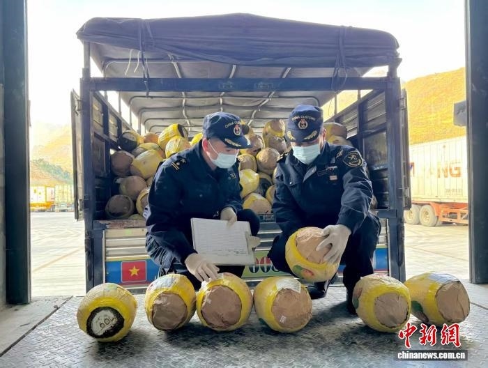 當(dāng)前正值東南亞水果上市季節(jié)。上午8點(diǎn),在天保口岸國(guó)際貨場(chǎng),中越兩國(guó)貨車在橫跨盤(pán)龍河的大橋上交錯(cuò)而過(guò)。一輛輛滿載越南新鮮荔枝、榴蓮的貨車有序駛?cè)胩毂?诎?,辦結(jié)通關(guān)手續(xù)后,這些水果將啟程運(yùn)往中國(guó)內(nèi)地。