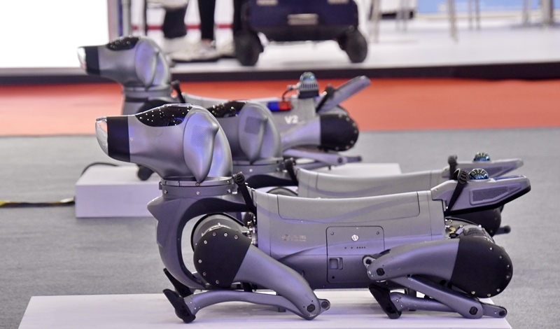 這是8月8日拍攝的2025世界機(jī)器人大會(huì)上展出的智能機(jī)器狗。